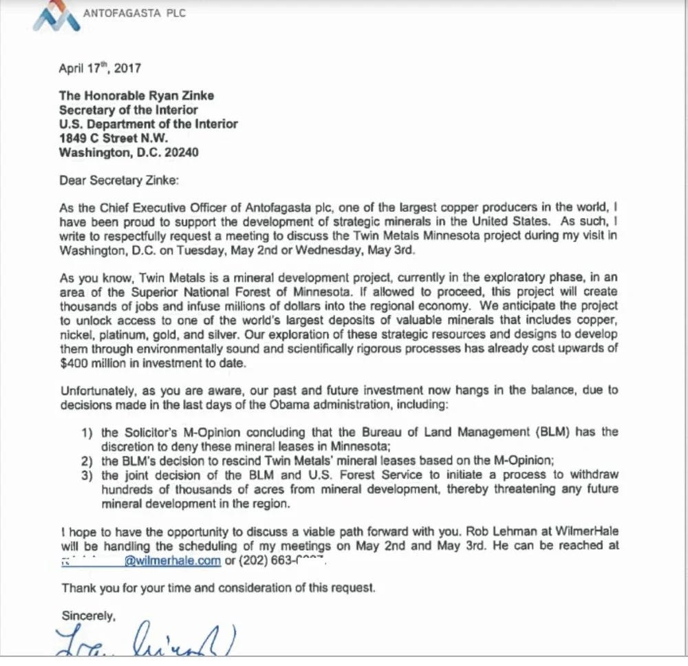 Antofagasta, the Chilean parent company of the mine operator, set out to lobby the incoming Trump administration to get that lease restored and the ban reversed.